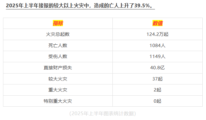 2025年上半年,全國消防救援隊伍共接報火災55.2萬起,亡1084人、傷1149人,直接財產損失40.8億元。因電氣故障、用火不慎引發火災占比25.4%。造成的死亡人數上升了39.5%