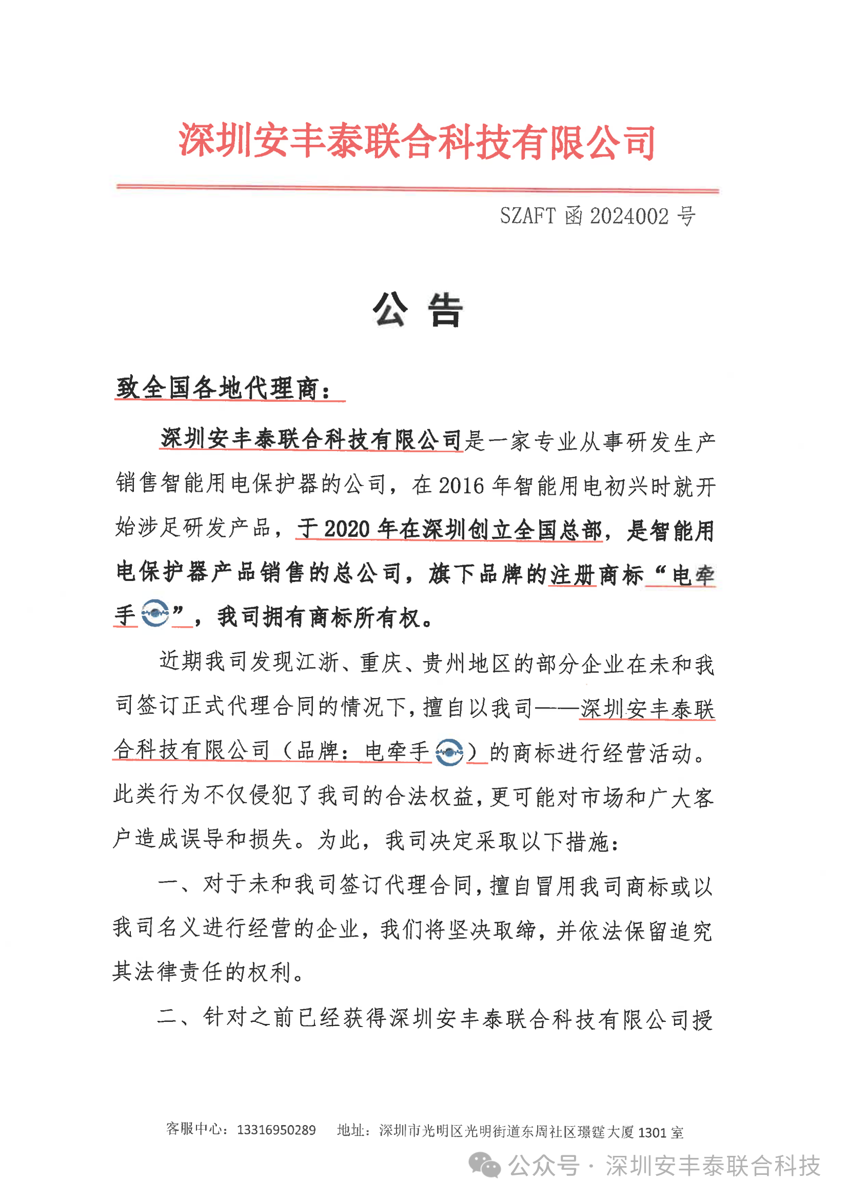 近期我司發(fā)現江浙、重慶、貴州地區(qū)的部分企業(yè)在未和我司簽訂正式代理合同的情況下,擅自以我司——深圳安豐泰聯合科技有限公司(品牌:電牽手 )的商標進行經營活動。此類行為不僅侵犯了我司的合法權益,更可能對市場和廣大客戶造成誤導和損失。為此,我司決定采取以下措施:
