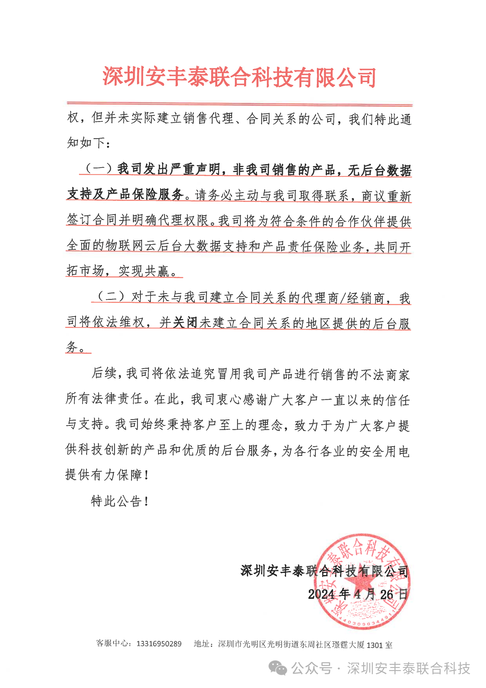 二、針對之前已經獲得深圳安豐泰聯合科技有限公司授權,但并未實際建立銷售代理、合同關系的公司,我們特此通知如下: